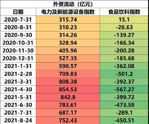 如果你持續(xù)跟蹤外資,就會發(fā)現(xiàn)從2016年陸股通開通之后,外資一直抱團大消費板塊,直到2020年8月,外資突然第一次出現(xiàn)資金的凈流出。而那個時候,很多散戶還在高位擁抱食品飲料。